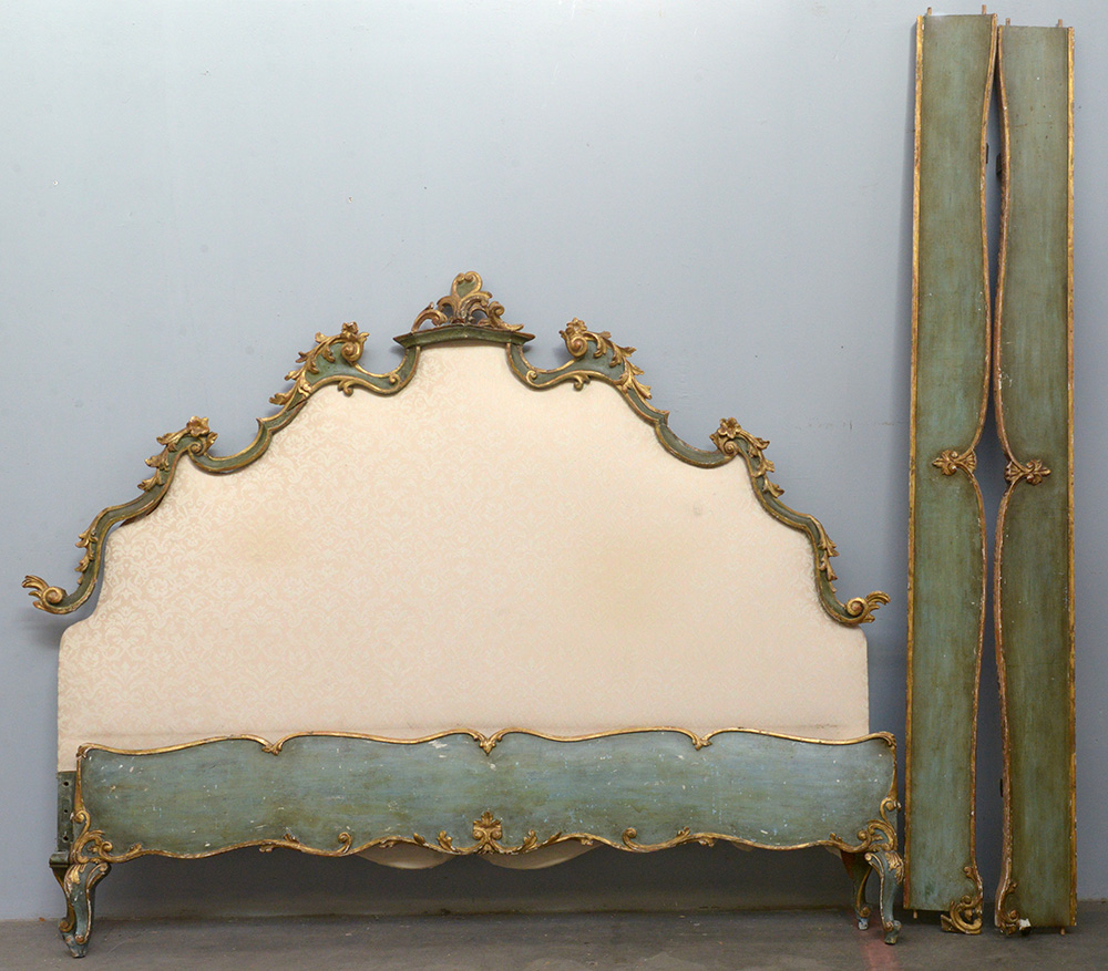 Letto matrimoniale di forma mossa con struttura in legno intagliato, laccato e dorato, testata con inserto in tessuto (difetti)