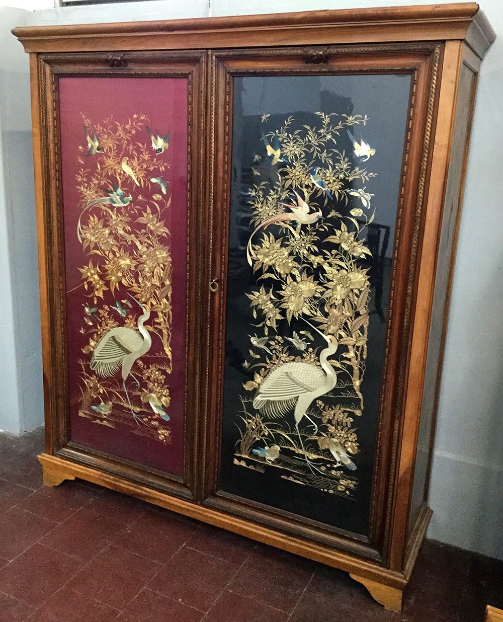 Armadio guardaroba in legno a due battenti incorniciati, ante decorate da pannelli ricamati in seta e fili d'oro zecchino, raffiguranti gru, uccelli e rami fioriti. Cina, 1870 ca. (cm 165x189x46) (difetti)