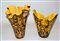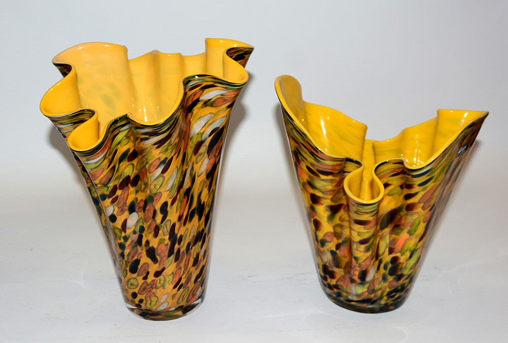 Lotto composto da due vasi a fazzoletto in vetro policromo, interni in vetro giallo (h max cm 33)