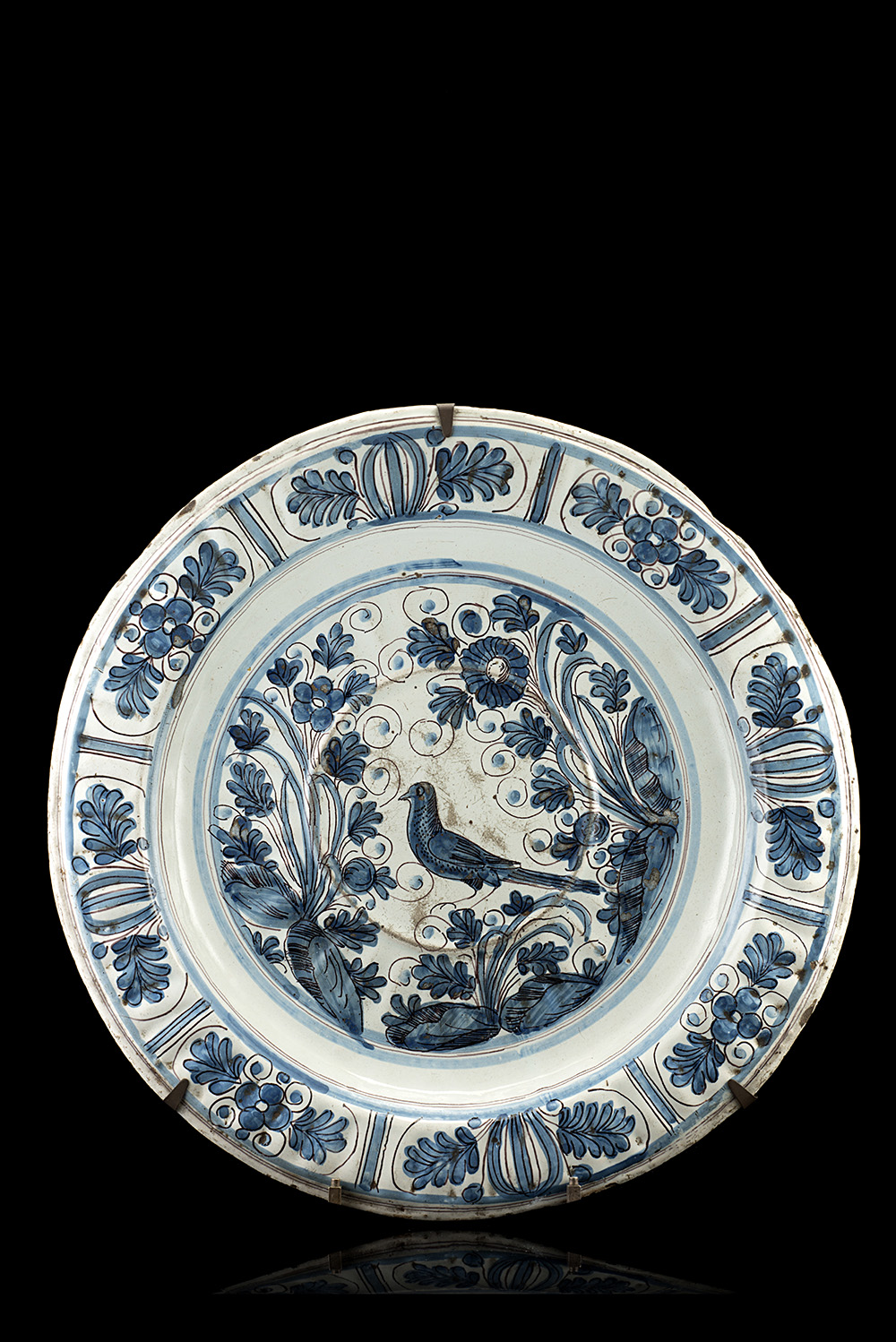 Manifattura di Pavia, secolo XVIII. Grande piatto in maiolica con decoro calligrafico nei toni del blu a volatile e rami fioriti nel cavetto e a volute fogliate intervallate da elementi geometrici nella bordura (d. cm 39) (difetti)