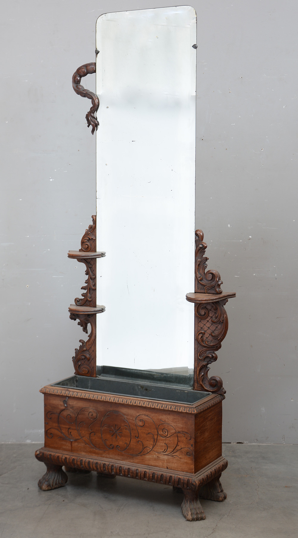 Fioriera da ingresso con base in legno intagliato e fondo a specchio (cm 78x192x28)(difetti e mancanze)