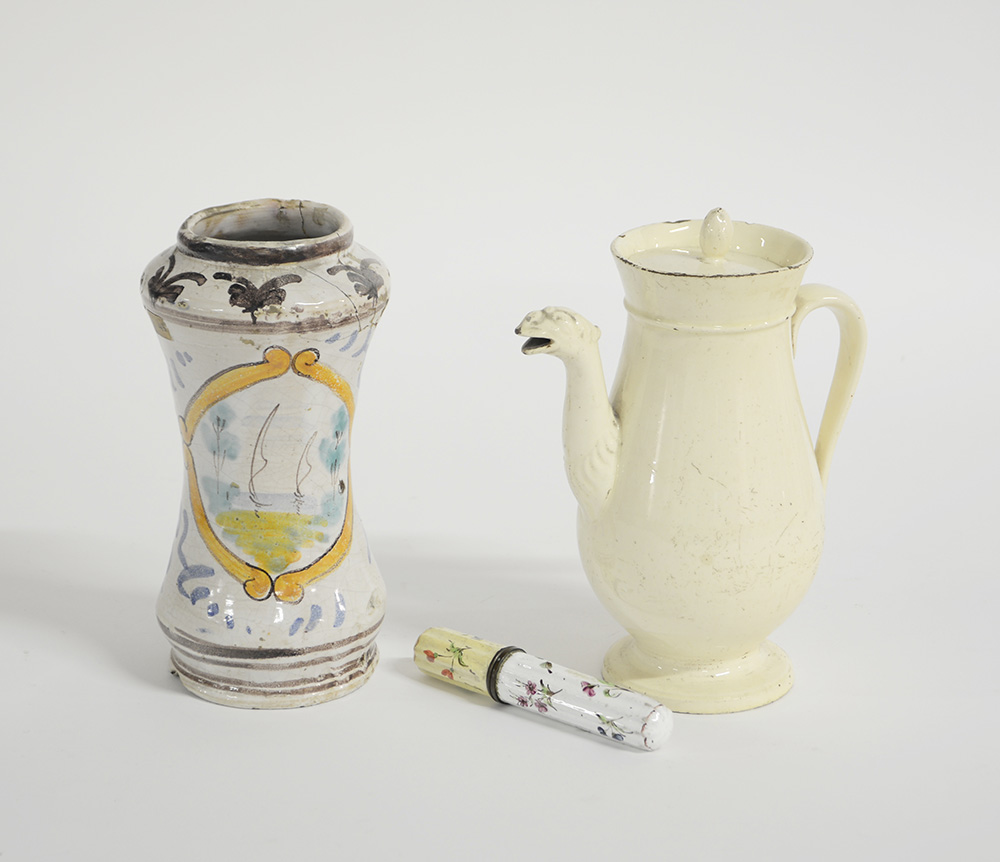 Lotto composto da un albarello in maiolica policroma, una teiera in ceramica bianca e un contenitore con coperchio a decoro floreale (difetti e restauri)