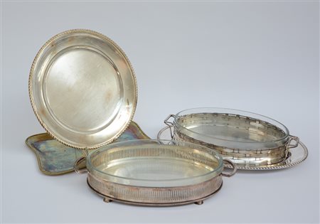 Lotto composto da due porta vivande in metallo argentato con interni in vetro e tre vassoi in metallo e ottone con bordi cordonati (difetti)