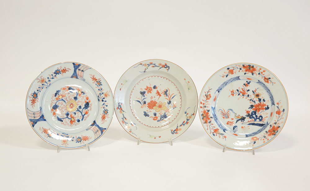 Tre piatti in porcellana a smalti Imari decorati con motivi floreali (d. max cm 23) (difetti e mancanze)