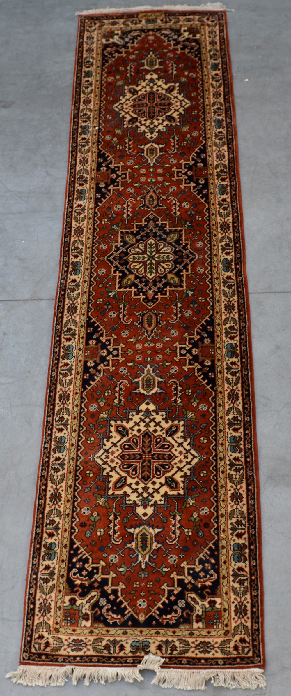 Tappeto rumeno, secolo XX. Disegno con tre medaglioni bianchi e blu su fondo ruggine (cm 310x75) lievi difetti