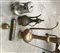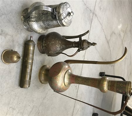 Manifattura orientale, lotto composto da due brocche, un boccale con coperchio, una campanella e un macinino in ottone, rame e metalli diversi (difetti e mancanze)