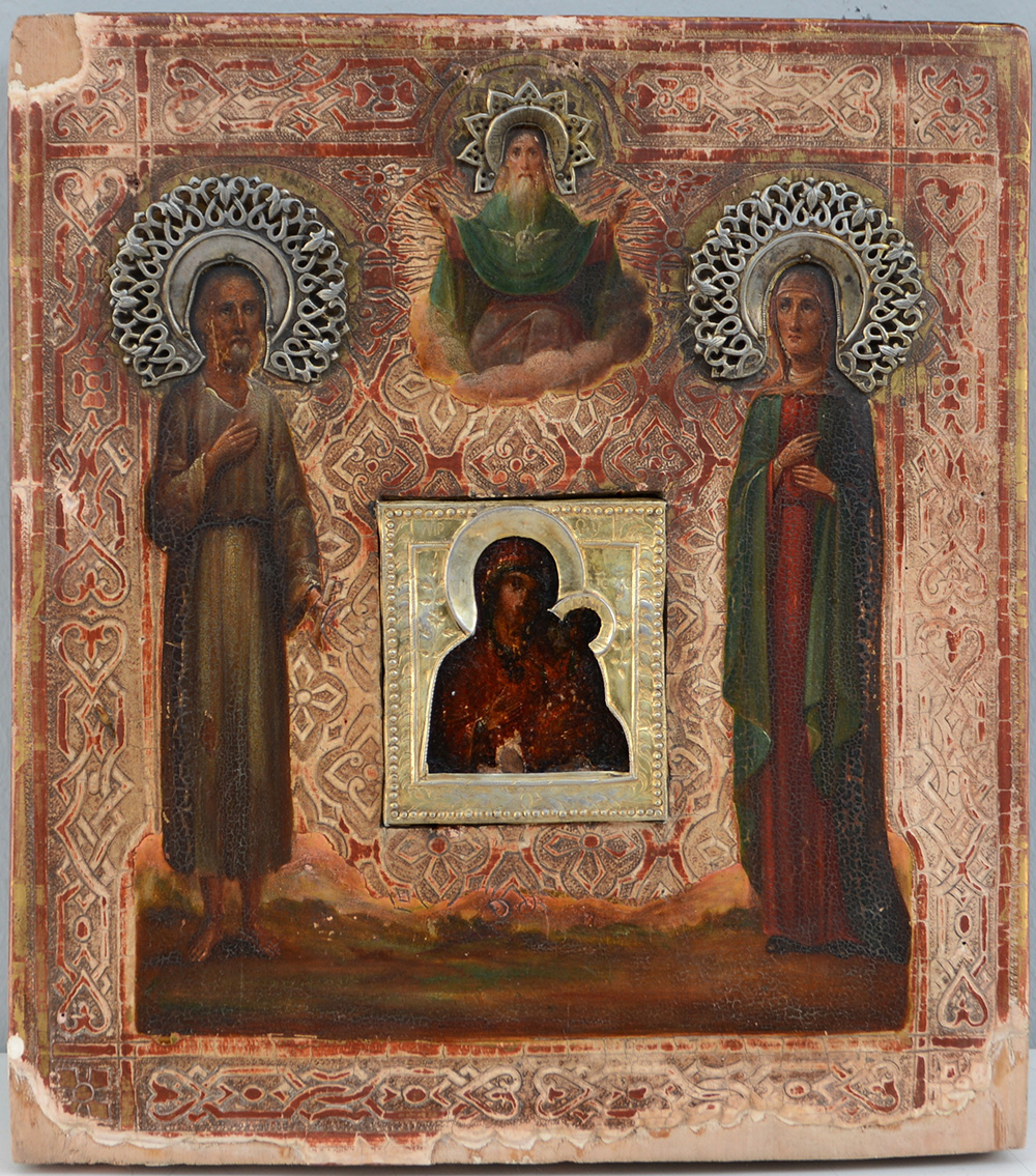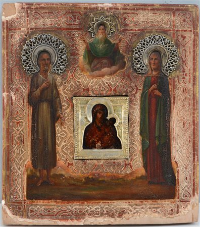 Icona a olio su tavola raffigurante Santi e Trinità, centrata da Madonna con Bambino con aureola in metallo (cm 33x29) Secolo XVIII (mancanze e restauri)