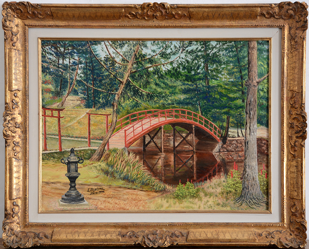 Elia Migliau (1900 - 1991) - ''Giardino con ponte rosso'', olio su tela (cm 46x61) firmato e datato in basso a sinistra, in cornice