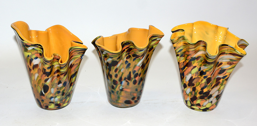 Lotto composto da tre vasi a fazzoletto in vetro policromo, interno in vetro giallo (h max cm 21)