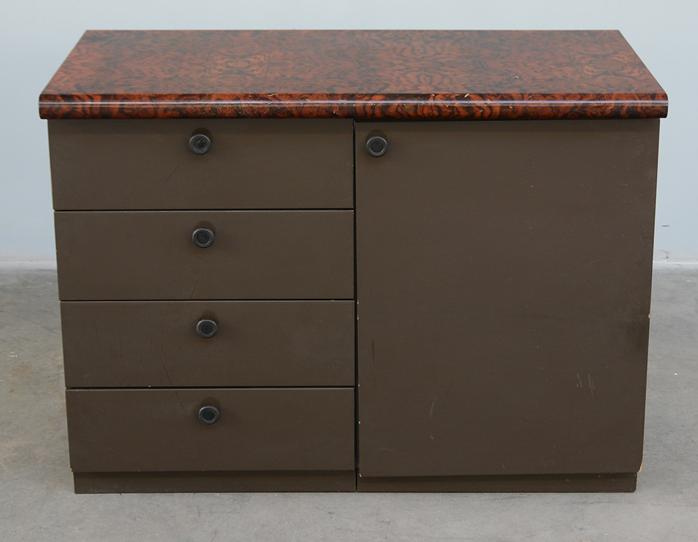 Mobile da ufficio a quattro cassetti e antina laterale. Piano radicato (cm 100x75x50)(difetti)