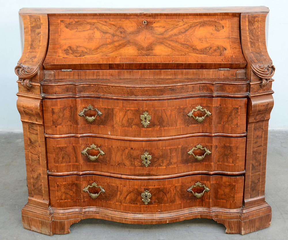 Ribalta lastronata in noce e radica di noce con fronte mossa a tre cassetti, decorata con filettature e maniglie in bronzo. veneto, secolo XVIII (cm 132x102x65) (difetti e restauri)
