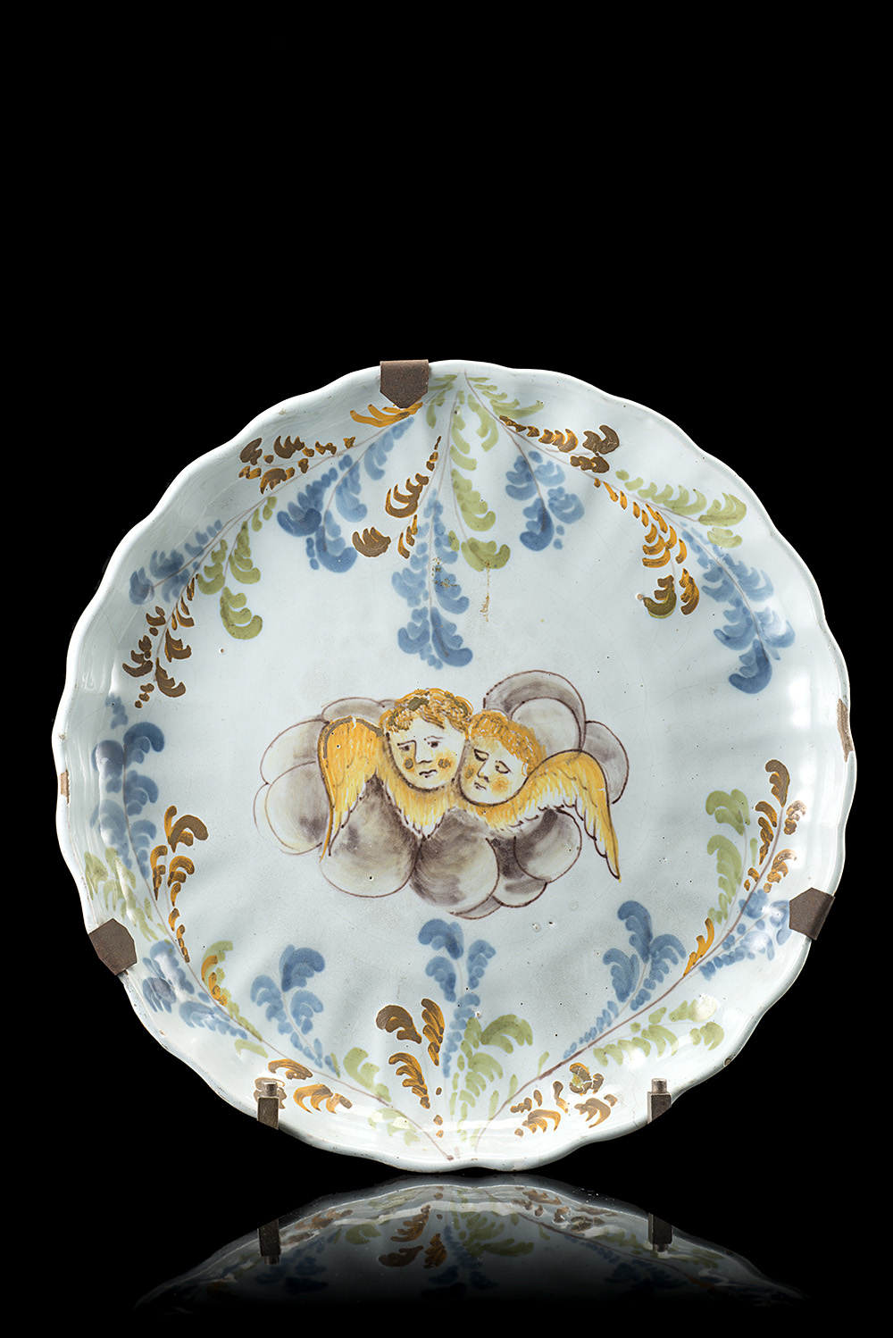 Manifattura di Pavia, secolo XVIII. Piatto in maiolica con bordo costolato decorato in policromia a cherubini nel cavetto e motivi vegetali nella falda (d. cm 23) (difetti)
