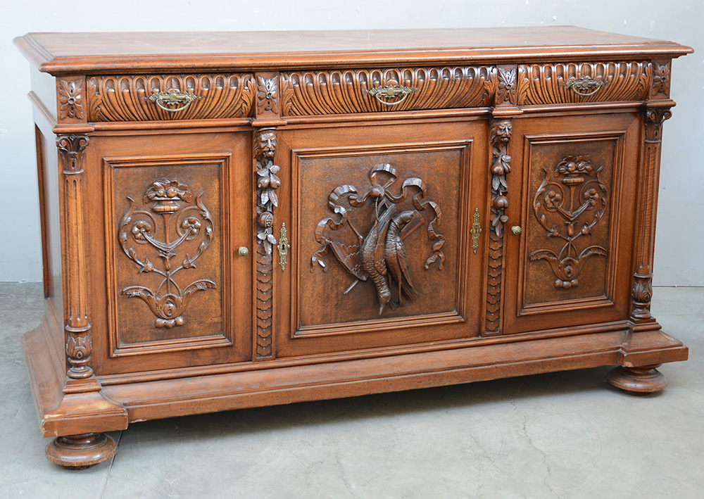 Credenza in noce intagliato, a tre ante e tre cassetti scolpiti con motivi animali (cm 178x100x64)(lievi difetti)
