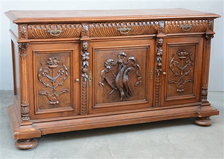 Credenza in noce intagliato, a tre ante e tre cassetti scolpiti con motivi...