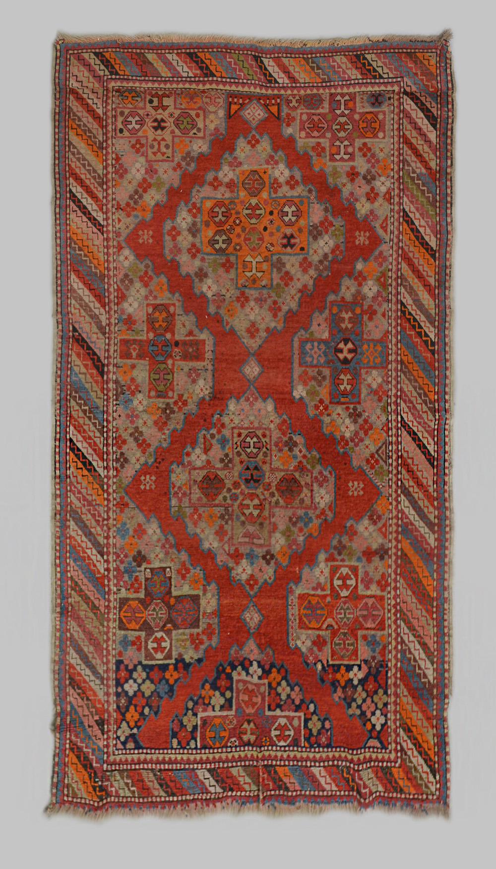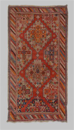 Tappeto Shiraz, Persia inizio secolo XX. Decoro con due medaglioni romboidali su fondo rosso (cm 201x112) (difetti e macchie)