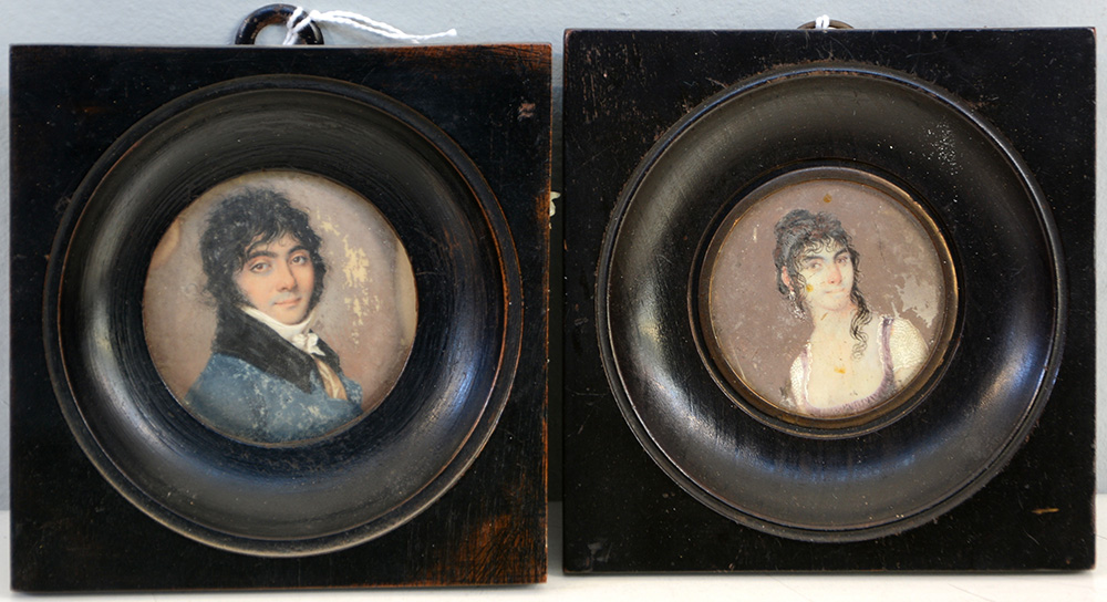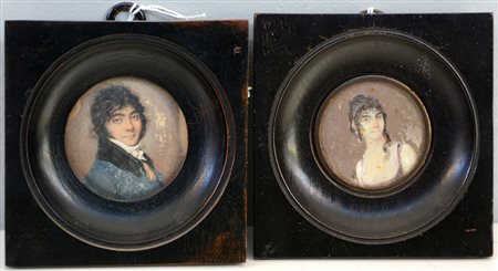 Ignoto, secolo XIX "Ritratti di Margherita Tealdi in Ruga di Gozzano e di suo figlio Carlo Ruga di Gozzano" coppia di miniature tonde su avorio (diam. 5) (difetti)