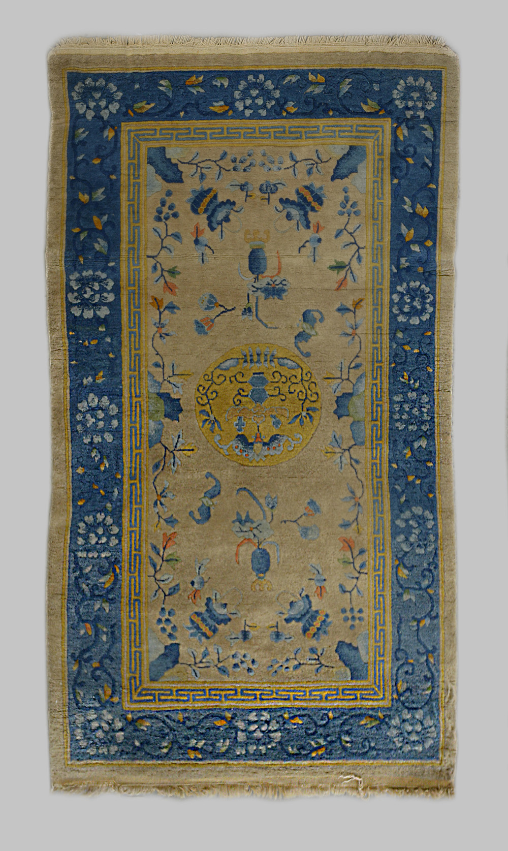 Tappeto cinese, secolo XX. Decoro con medaglione tondo giallo su fondo crema (cm 199x119) (difetti)