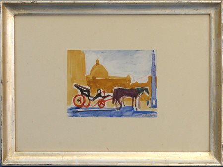 "Carrozzella a Roma" 1988, acquarello (cm 12x16) Firmato in basso a destra. Al retro: cartiglio e timbri.