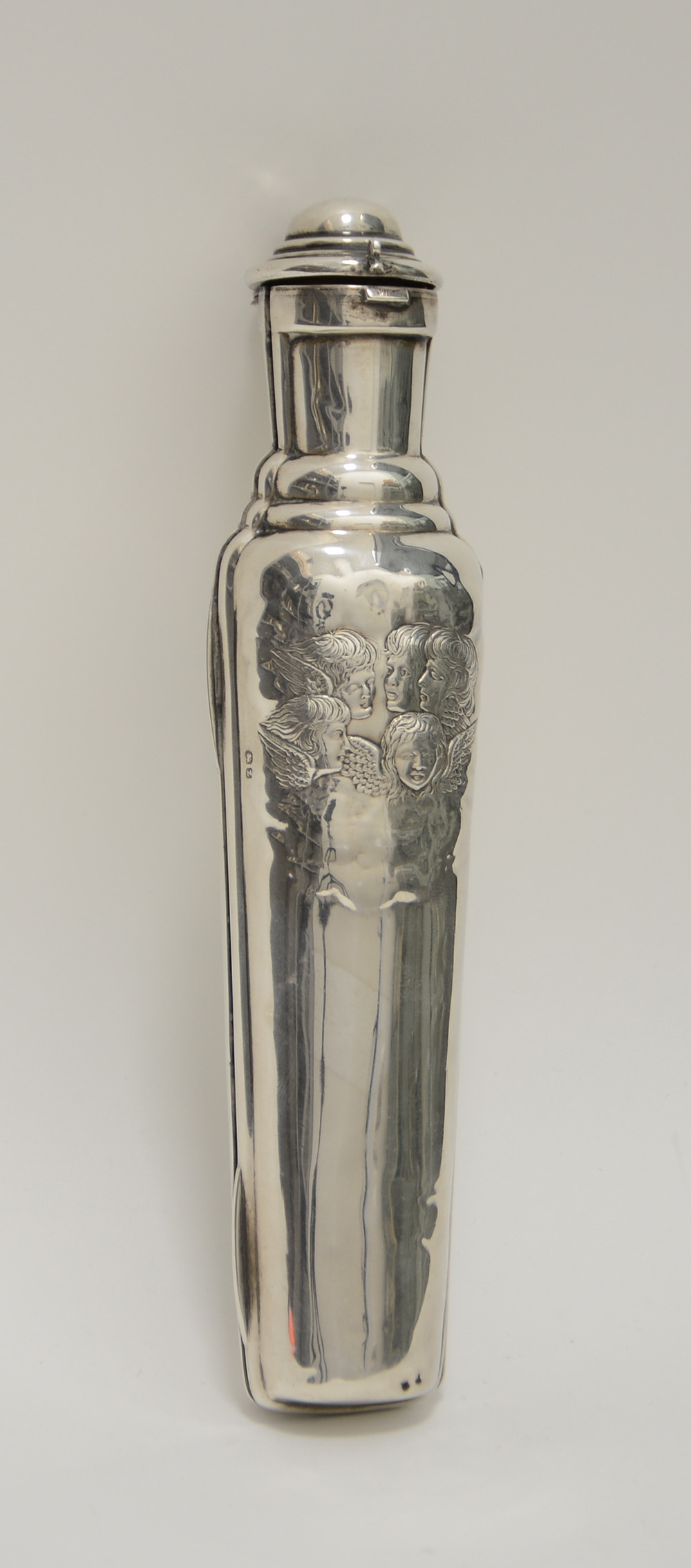 Porta profumi in argento sbalzato a cherubini, interno in vermeille. Punzoni di Birmingham, secolo XIX (g 114 ca.) (difetti)