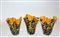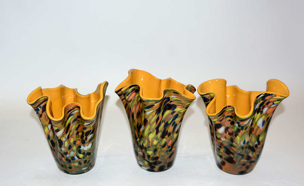 Lotto composto da tre vasi a fazzoletto in vetro policromo, interno in vetro giallo (h max cm 21,5)
