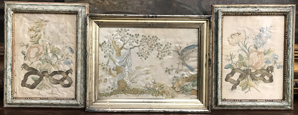 Lotto composto da tre ricami a punto lanciato, eseguiti in seta e fili d'argento raffiguranti motivi floreali e paesaggio. Secolo XIX (misure diverse) (difetti)