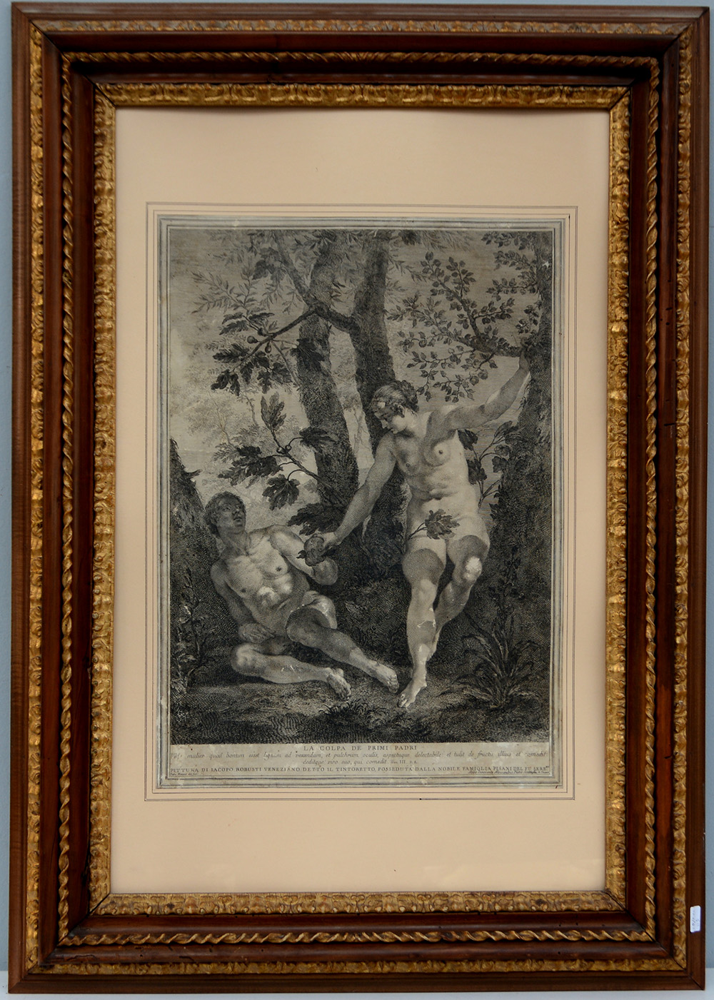 Incisione da Tintoretto "La colpa dei primi padri" (cm 50x35) Secolo XIX. In cornice in legno intagliato e parzialmente dorato (difetti)