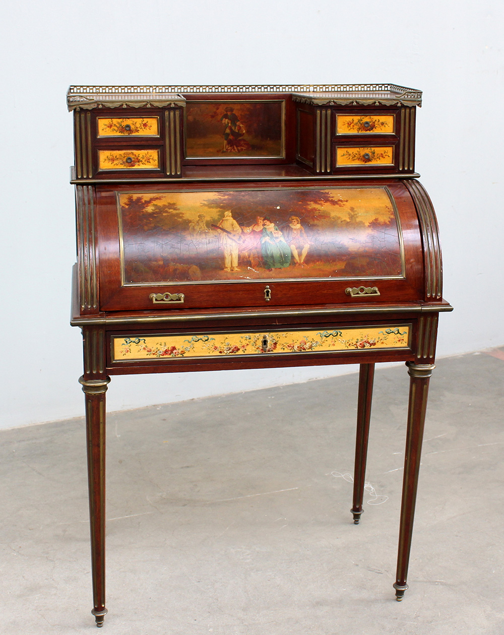 Ribalta a rullo decorata a verre peint a scena di genere, cassetti a ghirlande di fiori (cm 80x116x48) (difetti)