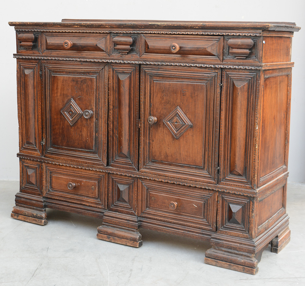 Credenza a due ante e quattro cassetti pannellati, profili intagliati a unghiature, piedi a mensola (cm 178x132x55)(mobile costruito utilizzando parti di mobili antichi, difetti)