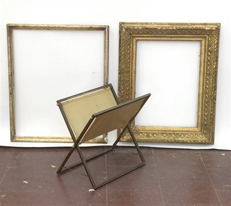 Lotto composto da due cornici e un portariviste pieghevole in materiali diversi (difetti)