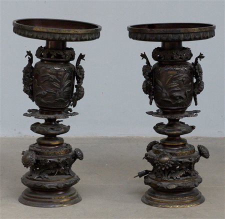 Coppia di portaceri in bronzo con decori floreali ad altorilievo. Giappone, periodo Meiji (1868-1912) (h. cm 60) (lievi difetti)