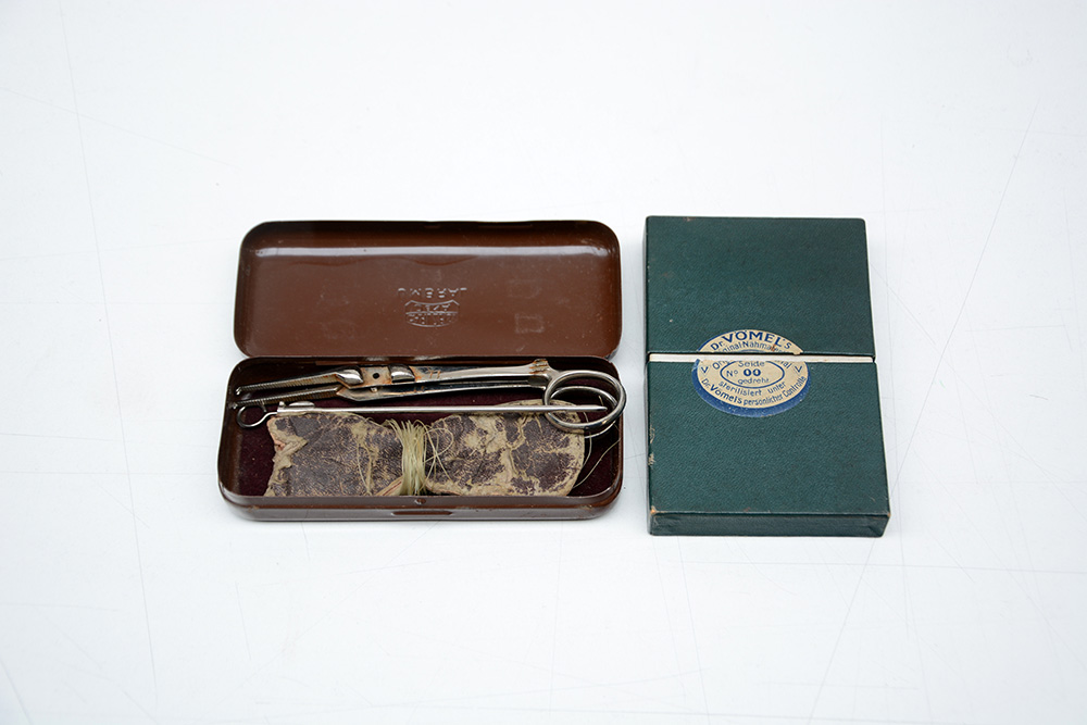Lotto composto da ago, pinza e scatola con fili per sutura