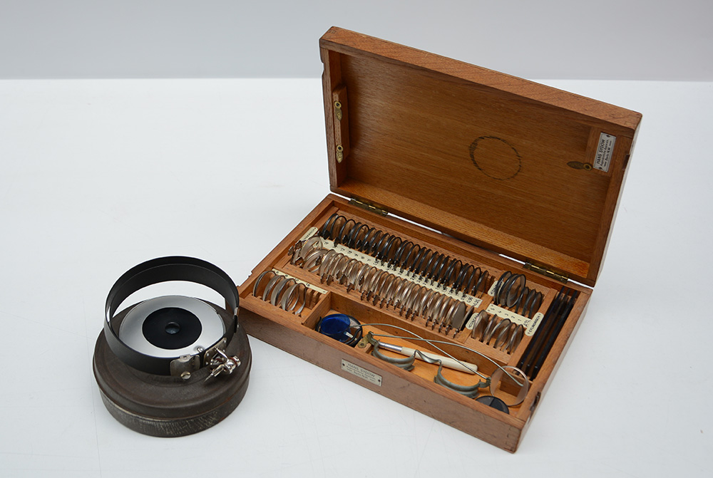 Lotto composto da cassetta oculistica e specchio frontale oculistico.
