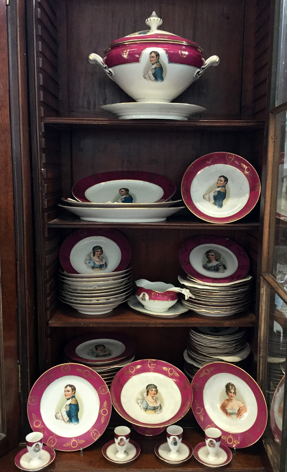 Manifattura boema, parte di servizio da tavola in porcellana dipinta a soggetto napoleonico con cavetti centrati da ritratti, composto da undici piatti fondi e venticinque piani, undici da dolce e undici da frutta, dieci porta uovo, tre piatti da portata ovali e uno tondo, due raviere e una salsiera, due alzate e una zuppiera. Inizio secolo XX (difetti)