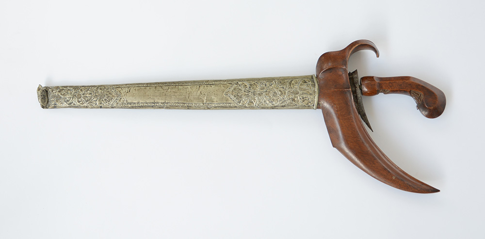 Kris malese con fodero in metallo argentato e lama ondulata di origine.