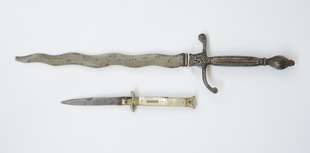 Lotto composto da coltello pieghevole con forniture in bronzo e guance in madreperla della fine del secolo XIX/Inizi secolo XX ed un pugnale (da Historismus) con lama ondulata e fornitura in ferro fusa (difetti)