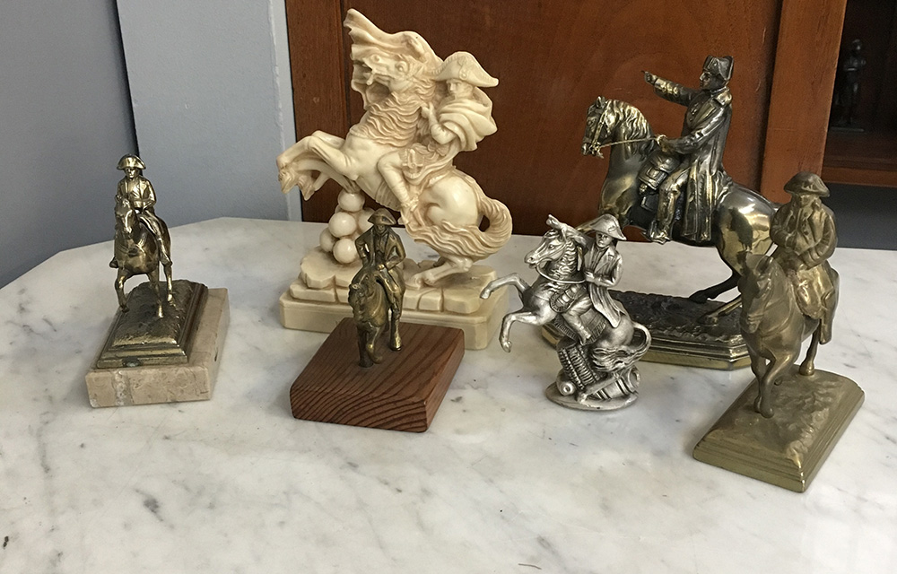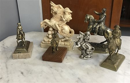 Lotto di sei statue equestri di Napoleone, una in resina rappresenta il passaggio delle alpi, le altre sono in metallo. (h. max cm 19x12,5) (difetti)