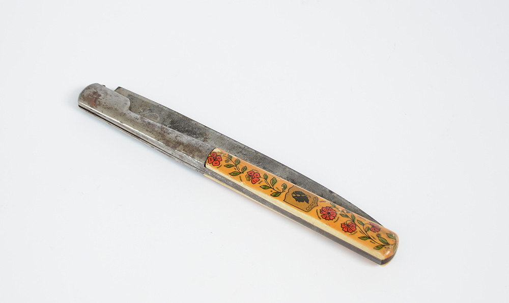 Grande coltello a serramanico con lama riportante alcune incisioni. Guancette del manico in osso. Corsica, secolo XX (cm 25 a lama chiusa) (difetti)