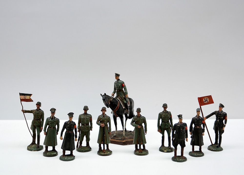 Undici soldatini in piombo dipinti di cui uno a cavallo. Raffigurano ufficiali, sottufficiali e soldati dell'esercito germanico e delle SS del periodo bellico. Sulle basi iscrizioni del militare raffigurato. 1940 (mm 120)(lievi difetti)