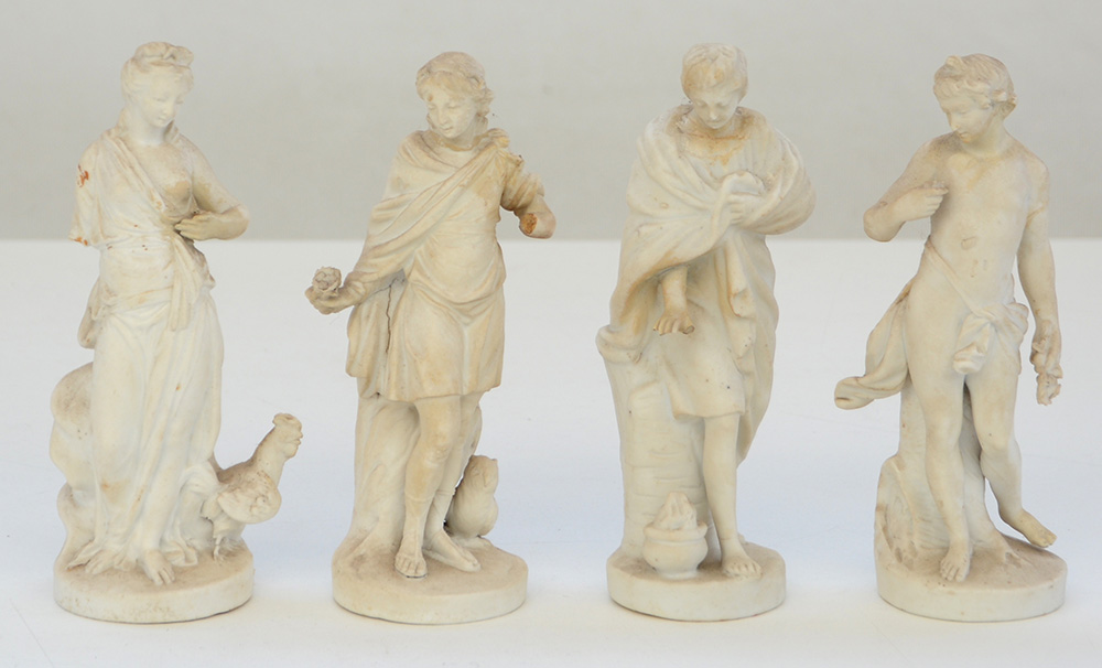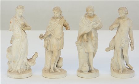 Manifattura del secolo XIX. Gruppo di quattro sculture in biscuit raffiguranti allegorie (h. cm 16) (difetti e mancanze)