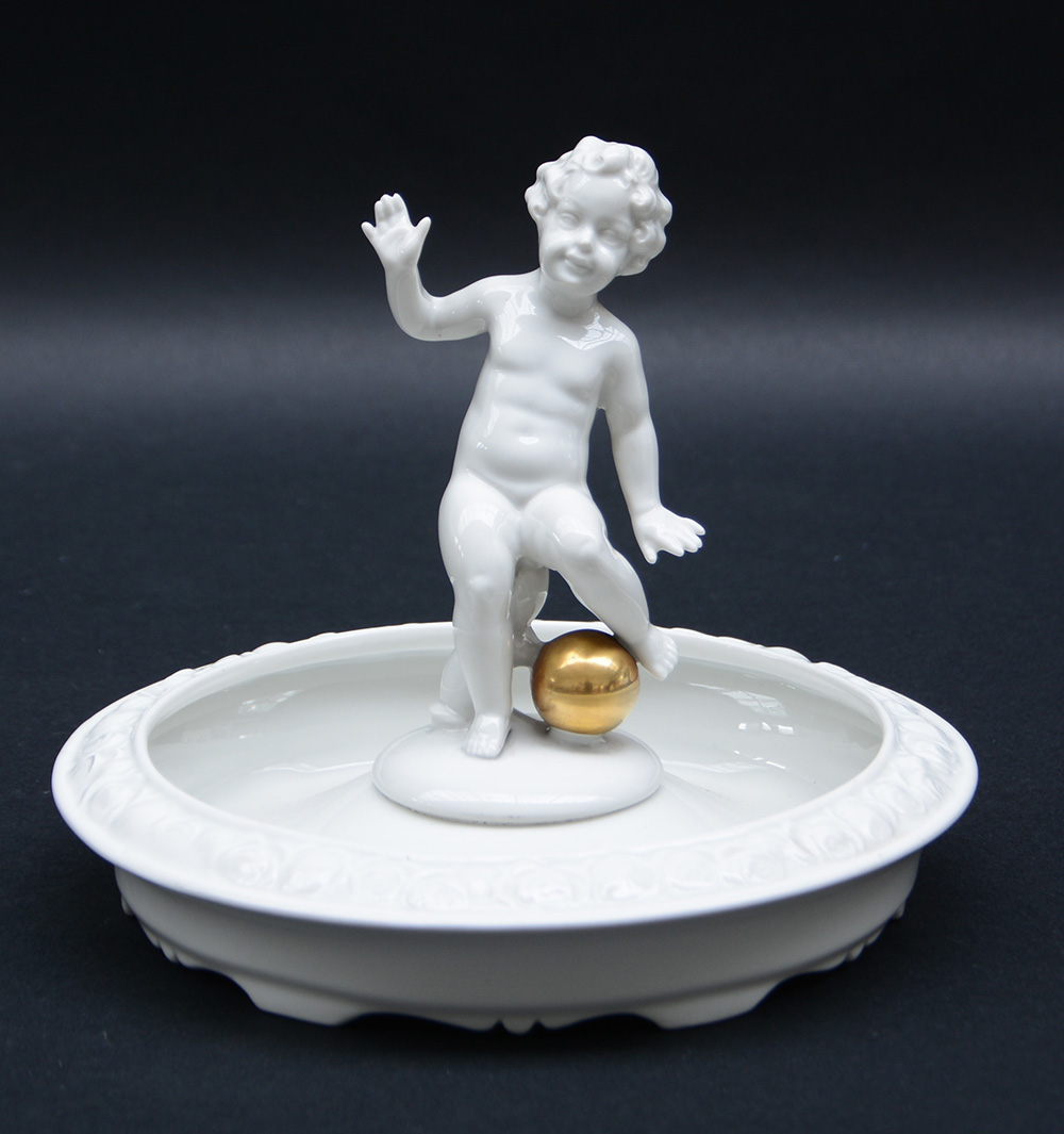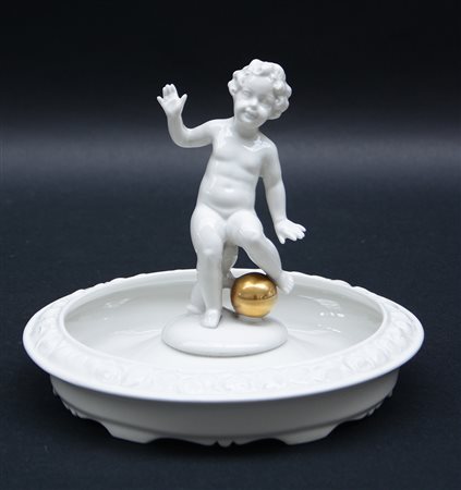 Manifattura tedesta, centrotavola in porcellana con amorino giocoso. Prima metà secolo XX (h cm 16; d cm 20)