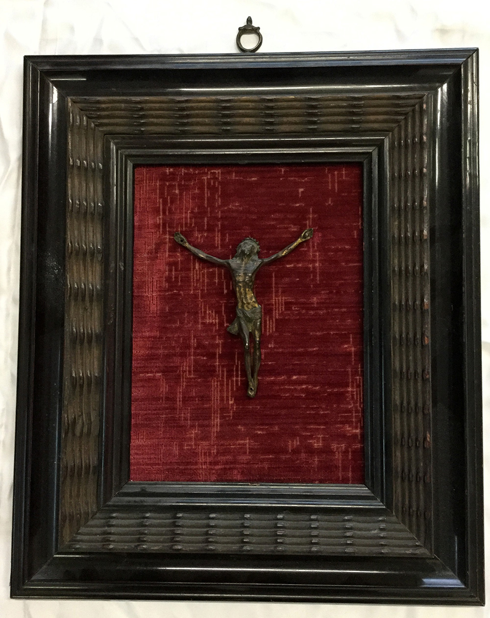 Crocefisso in bronzo montato su velluto entro cornice ebanizzata (cm tot 31x37) (difetti)
