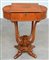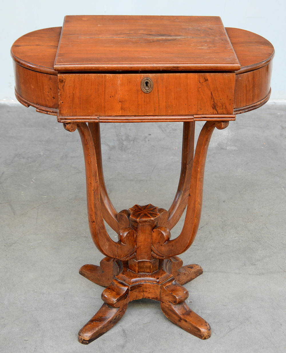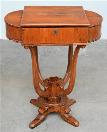 Tavolino da lavoro con piano a tre scomparti apribili, specchio e vani portaoggetti in quello centrale. Quattro sostegni e piedi a sagoma, fine secolo XIX (cm 63x74x40)
