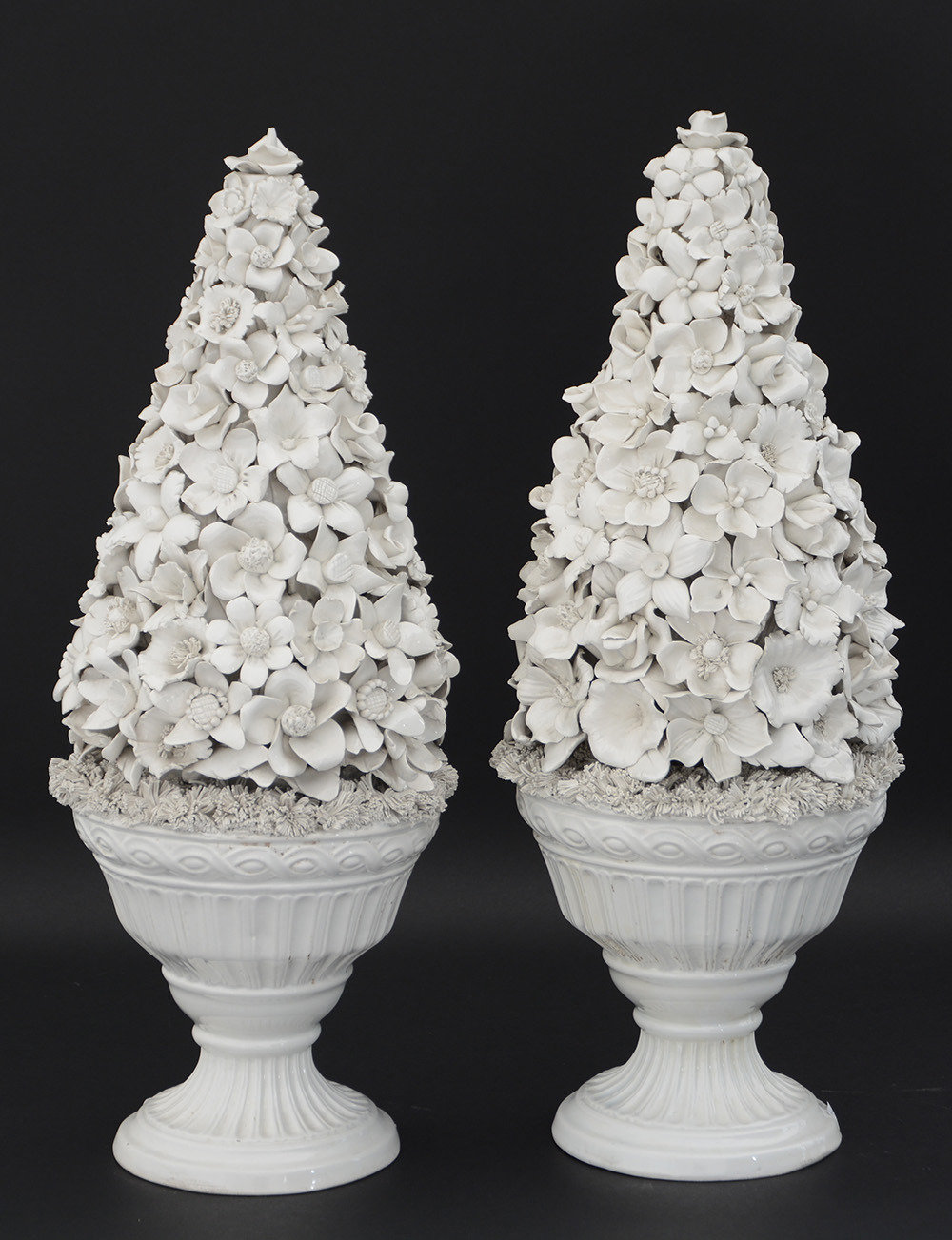 Coppia di contenitori con tappo in ceramica bianca a forma di vasi fioriti (h. cm 47) (lievi difetti e rotture)