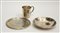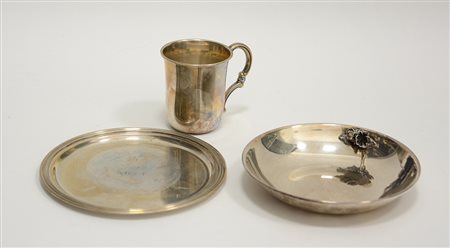 Lotto composto da piccolo bricchetto con manico, piattino iscritto "MGF" e ciotolina con applicazione a forma di rosa in argento (gr 210) (difetti)