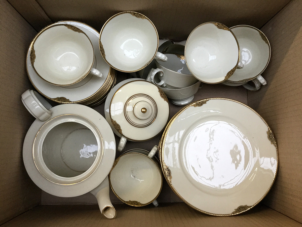 Manifattura tedesca, Seltmann. Parte di servizio da te in porcellana con profili dorati composto da 11 tazzine con 12 piattini, teiera, lattiera, zuccheriera e 12 piatti da dolce. (difetti)
