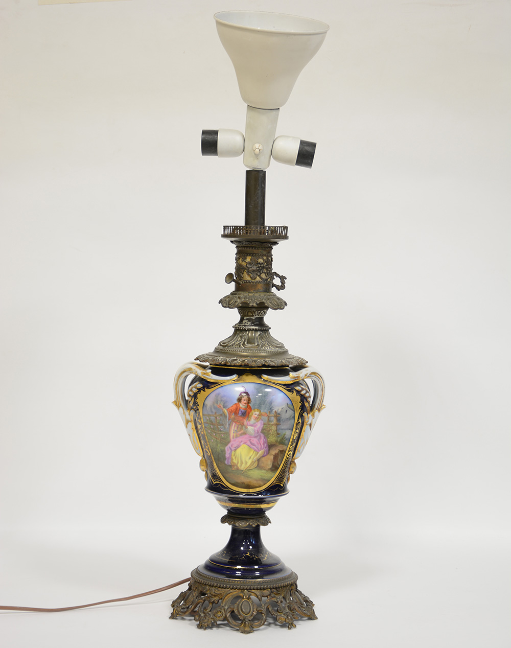 Vaso in porcellana decorato con riserve in policromia con scena galante e fiori, montato a luce elettrica (h cm 88) (difetti)