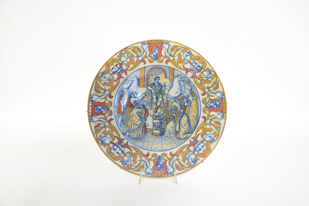 Piatto in maiolica decorato a raffaellesche e scena mitologica in policromia (d cm 41) (difetti)