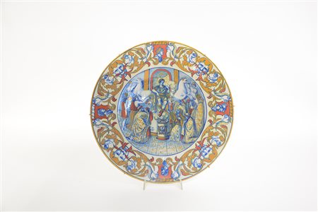 Manifattura itliana Piatto in maiolica decorato a raffaellesche e scena...