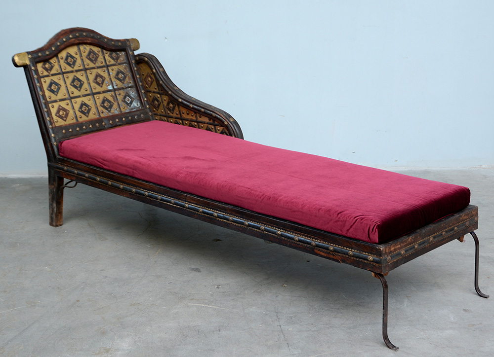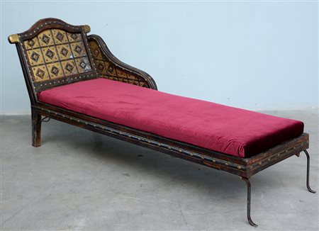 Chaise longue in legno con decorazioni metalliche e con cuscino in velluto rosso (lungh. max cm 200) (lievi difetti)�