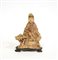 Scultura in pietra saponaria raffigurante Guanyin con scettro ruyi, seduta su roccia ornamentale, su base in legno (h cm 19)
